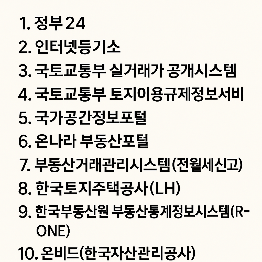 👉 이 10개 사이트는 부동산 실무 필수 툴이라고 할 수 있습니다. 토지·건물 확인, 거래 신고, 실거래가 분석, 정책 자료까지 전부 한 곳에서 확인 가능하니 꼭 참고해 보세요.