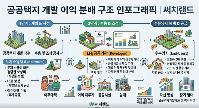 택촉법 체계의 가장 근본적인 문제는 공공택지 개발이 토지 소유자의 이익을 수용하여 수분양자에게 이전하는 구조라는 점입니다. 토지 소유자는 공시지가 기준 보상을 받고 수용되는 반면, 수분양자는 시세보다 낮은 가격으로 새 아파트를 취득합니다. 이 과정에서 발생하는 개발 이익은 LH와 수분양자 사이에 분배되며, 원래 토지 소유자에게 귀속되지 않습니다.
