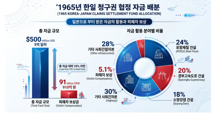 1965년 한일협정 청구권 자금 5억 달러 배분 현황 – 포항제철, 경부고속도로, 소양강댐, 피해자 보상 비교 차트